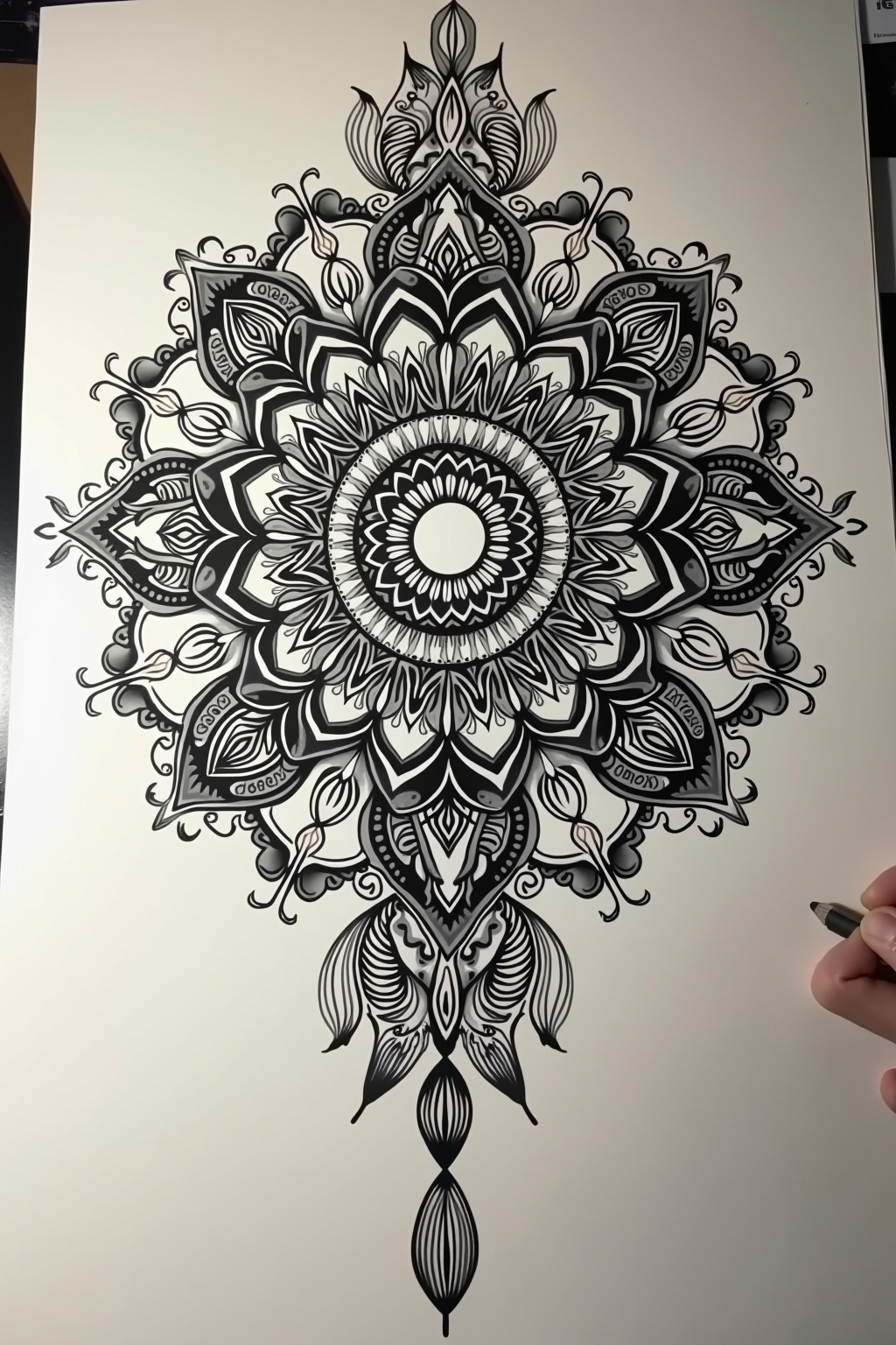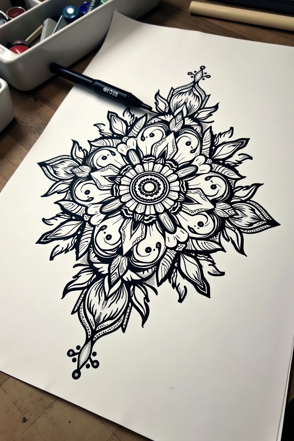 Das Erstellen eigener Mandala Tattoo Vorlagen kann ein bereichernder künstlerischer Prozess sein, der dir ermöglicht, ein vollkommen persönliches Design zu entwickeln. Du benötigst lediglich Zeichenpapier, verschiedene Zirkel, feine Stifte und eventuell Lineal oder Geodreieck, um präzise geometrische Formen zu erzeugen. Beginne mit einem Punkt in der Mitte und arbeite dich mit konzentrischen Kreisen nach außen vor, wobei du symmetrische Muster hinzufügst, die deine persönliche Geschichte oder Symbolik widerspiegeln. Experimentiere mit verschiedenen Elementen wie Lotusblüten, spirituellen Symbolen oder geometrischen Formen, die in traditionellen Mandalas häufig vorkommen und deinem Design Tiefe verleihen. Zum Üben kannst du bestehende Mandala-Motive studieren und deren Strukturprinzipien analysieren, bevor du deine eigenen kreativen Ideen einbringst. Nach dem Fertigstellen des Grunddesigns kannst du es durch Nachzeichnen mit einem Fineliner oder schwarzem Stift finalisieren und anschließend für deinen Tätowierer kopieren oder einscannen. Die selbst erstellten Mandala Tattoo Vorlagen haben nicht nur den Vorteil der vollkommenen Individualität, sondern stellen auch sicher, dass dein künftiges Tattoo eine tiefere persönliche Bedeutung trägt.