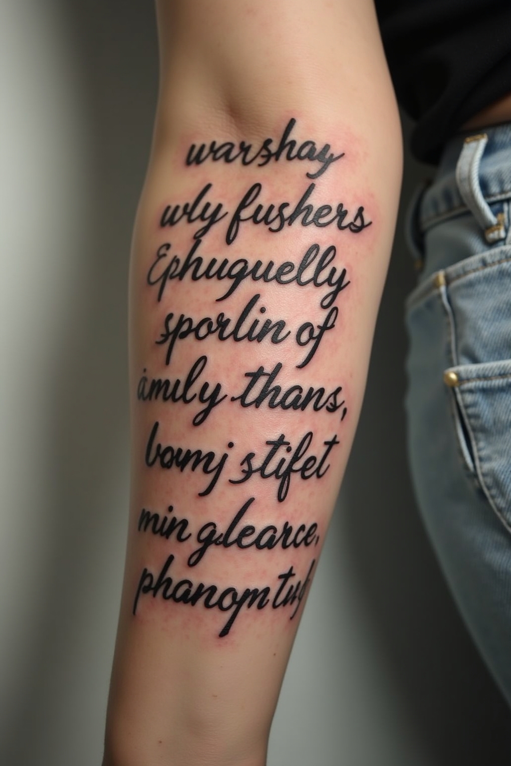 Die Wahl der richtigen Schriftart für dein Tattoo kann genauso bedeutsam sein wie die Worte selbst, denn sie verleiht deinem persönlichen Statement eine visuelle Stimme. Von eleganten kalligrafischen Linien, die an handgeschriebene Briefe vergangener Zeiten erinnern, bis hin zu kantigen Graffiti-Designs, die urbane Energie ausstrahlen – das Spektrum an Möglichkeiten ist nahezu grenzenlos. Besonders beliebt sind derzeit minimalistische Schriften, die mit ihrer schlichten Eleganz eine zeitlose Wirkung erzielen und selbst nach Jahren noch modern wirken. Wer es traditioneller mag, findet in Old English oder Gothic-Schriftarten kraftvolle Ausdrucksformen mit historischem Tiefgang, die besonders bei längeren Zitaten oder Lebensmottos eindrucksvoll zur Geltung kommen. Für einen persönlicheren Touch kannst du sogar die Handschrift eines geliebten Menschen als Vorlage verwenden – ein besonders emotionales Element, das deinem Tattoo eine einzigartige Bedeutungsebene verleiht. Asiatische Schriftzeichen oder arabische Kalligrafie bieten nicht nur ästhetischen Reiz, sondern können auch kulturelle Verbindungen oder spirituelle Bedeutungen transportieren. Bevor du dich festlegst, solltest du verschiedene Schriftmuster auf deiner Haut testen und bedenken, dass komplexe Designs mit feinen Linien mit der Zeit verschwimmen können, während klare, einfachere Schriften oft besser altern.