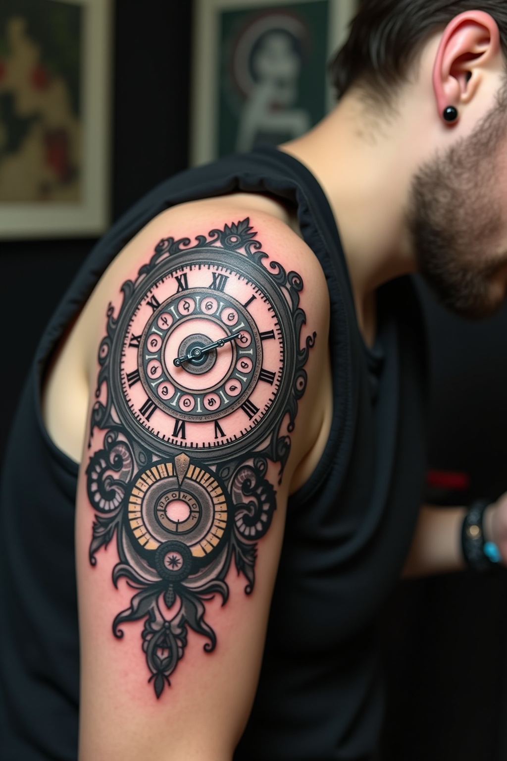 Die Vielfalt an Stilrichtungen für dein Uhr-des-Lebens-Tattoo ist nahezu grenzenlos und bietet dir zahlreiche Möglichkeiten, deine persönliche Geschichte zu visualisieren. Du kannst dich für einen realistischen Stil entscheiden, bei dem jedes Detail der Uhr, jeder Zeiger und jedes Zahnrad mit fotografischer Genauigkeit dargestellt wird. Alternativ verleiht ein Watercolor-Design deinem Lebenszeitmesser eine traumhafte, fließende Ästhetik, als würden die Stunden sanft ineinander übergehen. Für Liebhaber des Minimalistischen eignet sich ein schlichtes Liniendesign, das die Essenz der Uhr auf das Wesentliche reduziert und dennoch ihre tiefe Symbolik beibehält. Der Neo-Traditional-Stil kombiniert klare Linien mit kräftigen Farben und verleiht deinem Uhr-des-Lebens-Tattoo eine moderne, ausdrucksstarke Note. Wer es dramatischer mag, findet im Trash-Polka-Stil mit seinen charakteristischen roten und schwarzen Farbakzenten sowie collageartigen Elementen eine packende Ausdrucksform für die Vergänglichkeit der Zeit. Besonders beliebt sind auch Dotwork-Designs, bei denen die Uhr aus unzähligen winzigen Punkten entsteht und so eine beeindruckende Tiefe und Dimension erhält. Nicht zuletzt bietet der geometrische Stil mit seinen präzisen Formen und symmetrischen Mustern eine faszinierende Möglichkeit, die mathematische Perfektion der Zeit in einem modernen, strukturierten Design festzuhalten.